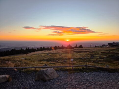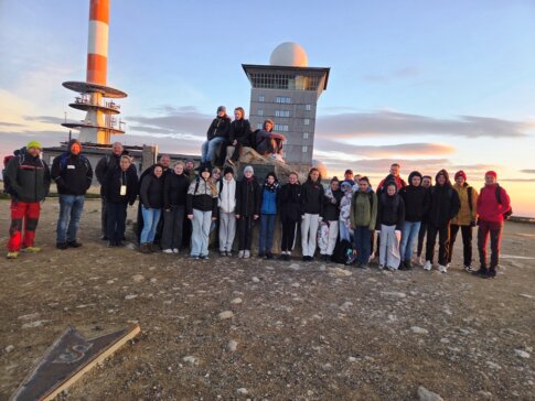 Von der Dunkelheit ins Licht – ein Ausflug, den wir so schnell nicht vergessen werden. Am frühen Morgen – oder besser gesagt mitten in der Nacht – traf sich die Klasse 8b mit einigen wanderfreudigen Eltern um 2 Uhr an der Schule. Während andere noch tief schliefen, machten wir uns auf den Weg zum höchsten Gipfel Norddeutschlands: dem Brocken. Unser besonderes Vorhaben: den Sonnenaufgang erleben – live und in Farbe. Nach knapp 1.5h Busfahrt und einem verschlafenen Start begann der Aufstieg. Mit Stirnlampen, viel Proviant und guter Laune kämpften wir uns durch die Dunkelheit. Die Stimmung war überraschend gut. Es wurde gesungen und sich in den Büschen versteckt, um die nachkommenden Mitschüler zu erschrecken. Bereits beim Aufstieg konnten wir die ersten Verfärbungen des Himmels beobachten und oben angekommen, wurden wir belohnt: klarer Himmel, fantastische Sicht und ein Sonnenaufgang wie aus dem Bilderbuch. Die ersten Strahlen tauchten den Horizont in orange-goldene Töne, bevor die Sonne sich langsam am Horizont zeigte. Nach zahlreichen Selfies und Gruppenfotos mit verwehten Frisuren am Gipfel ging’s wieder bergab. Der Ausflug war nicht nur ein Naturerlebnis, sondern auch ein echtes Gemeinschaftsgefühl – und definitiv ein Highlight unseres Schuljahres.